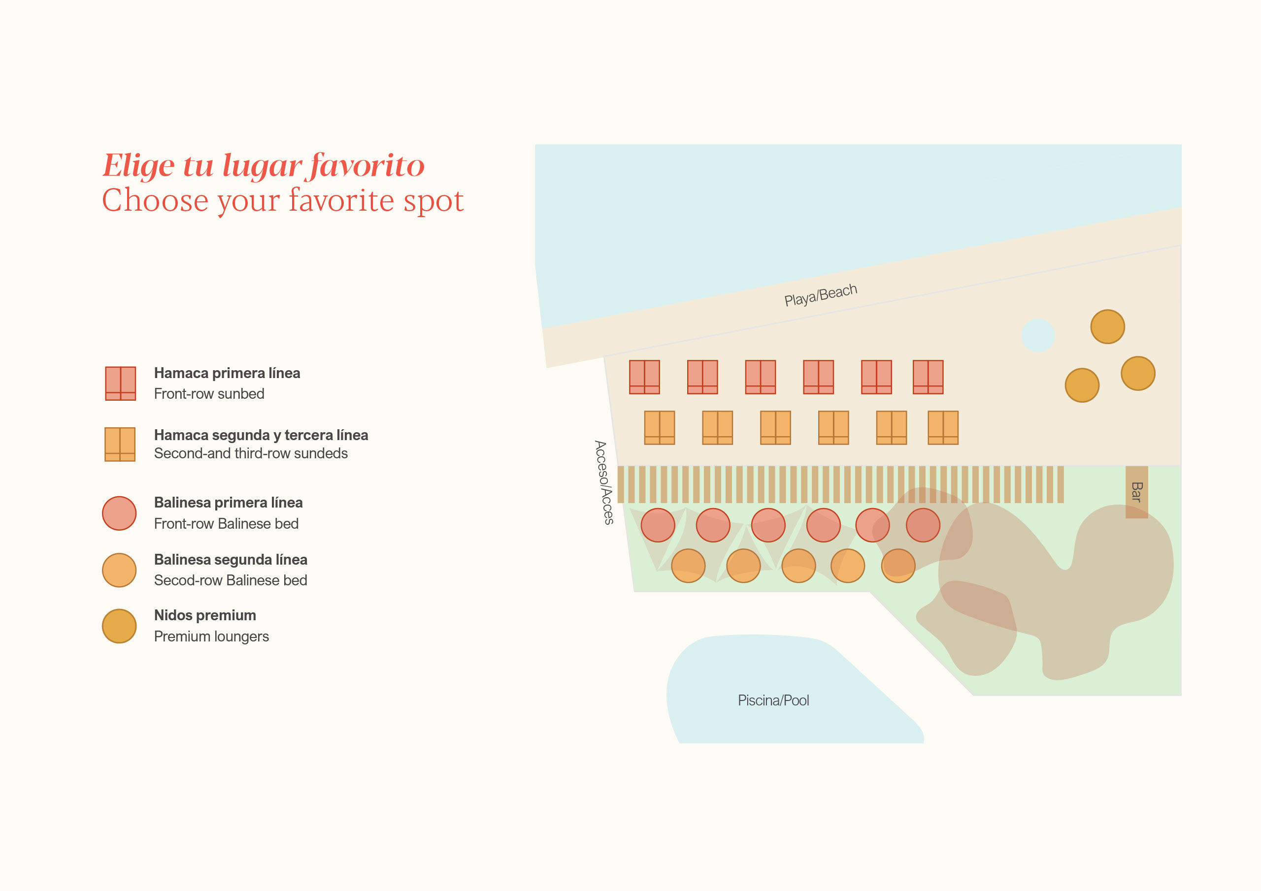 Relájate en nuestras camas balinesas y hamacas frente al agua, con servicio cuidado y todas las comodidades para un día perfecto.